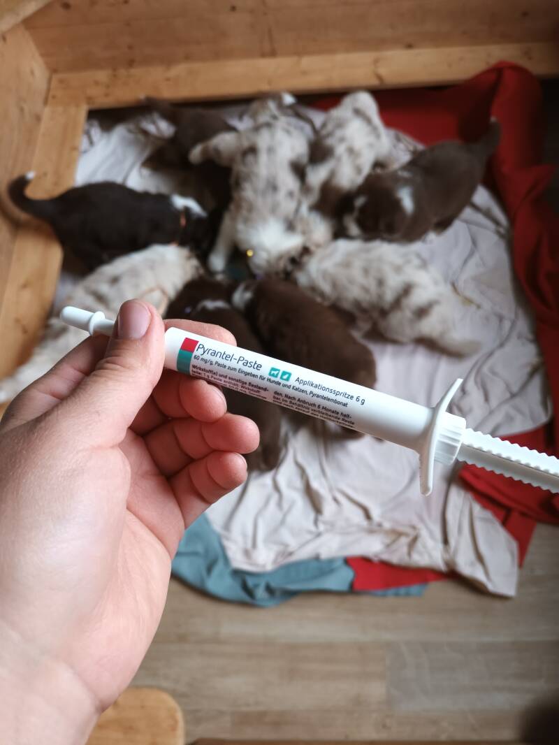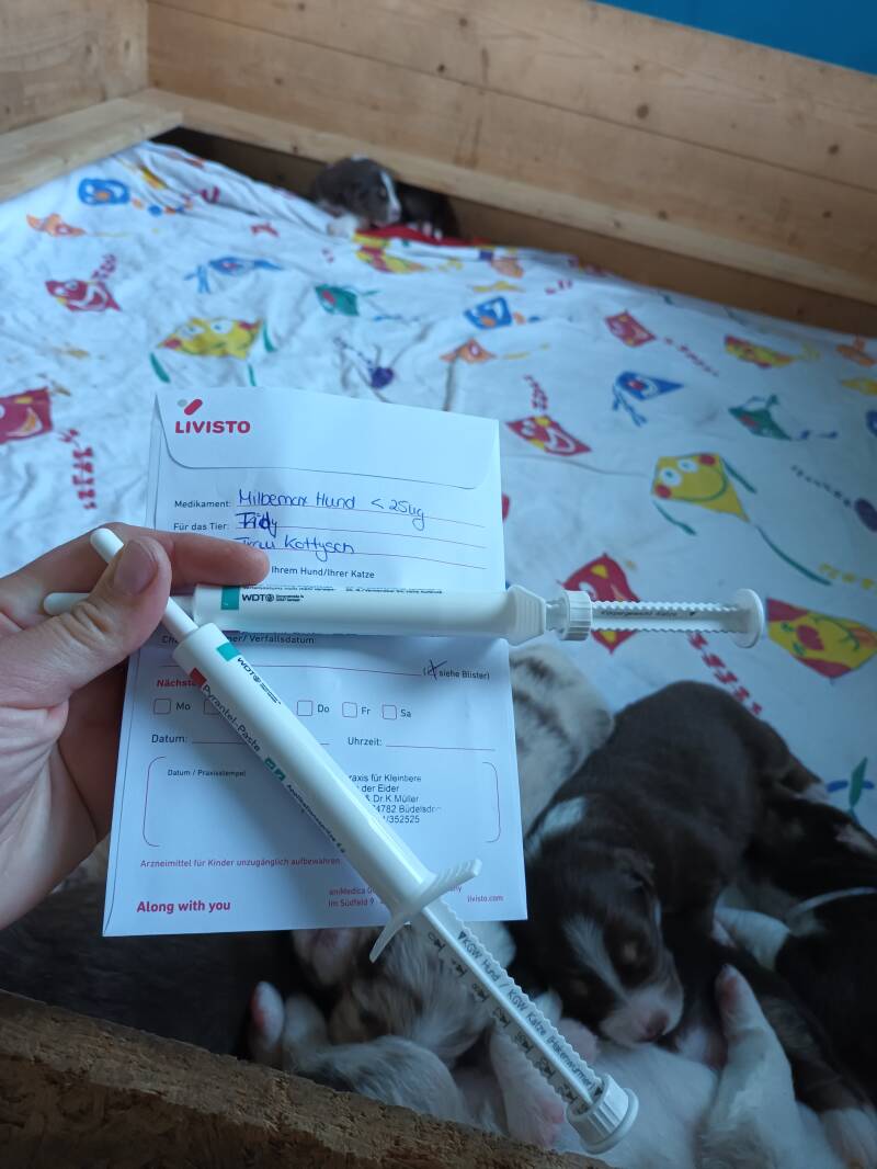 Heute werden die kleinen Racker schon 4 Wochen alt. D.h. es ist wieder Wurmkur-Zeit. Alle neun kleinen Nase haben es mit Fassung genommen. Als würden sie wissen, dass es wichtig für ihre Gesundheit ist :-)