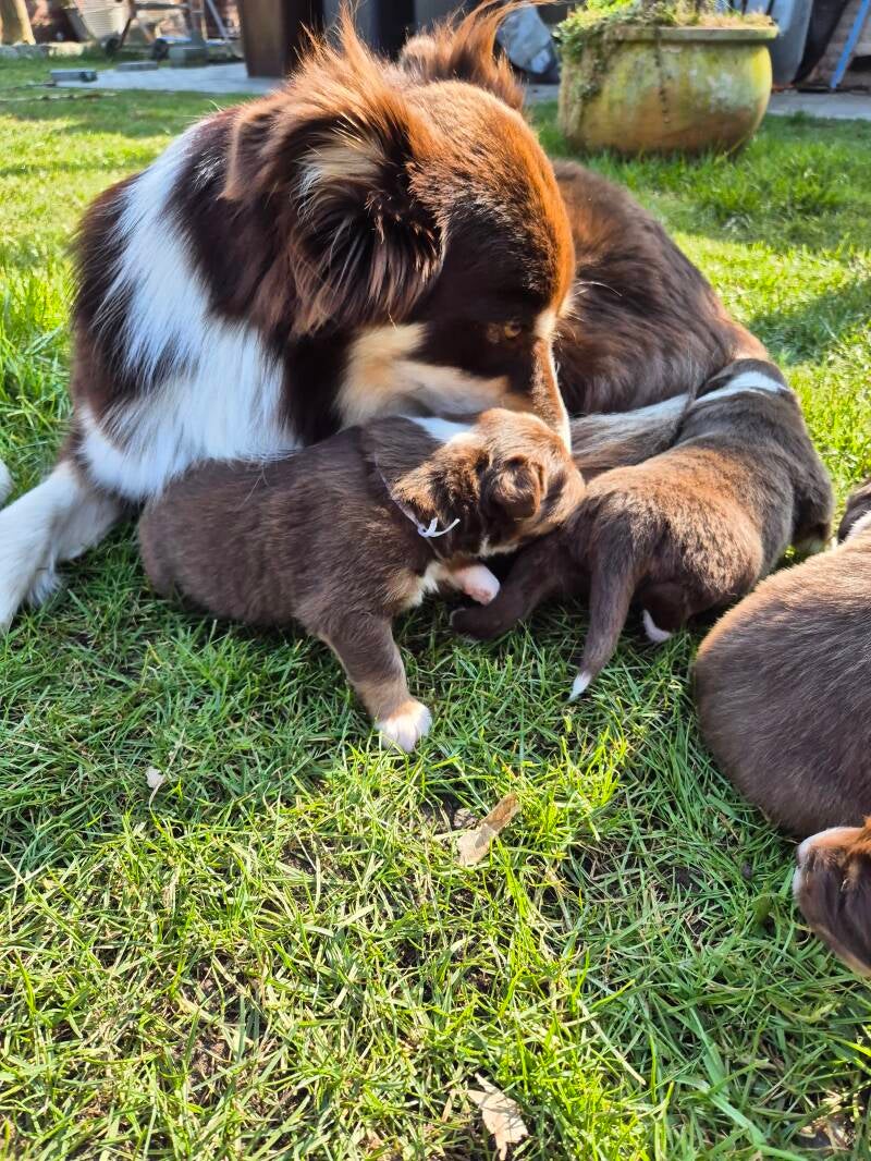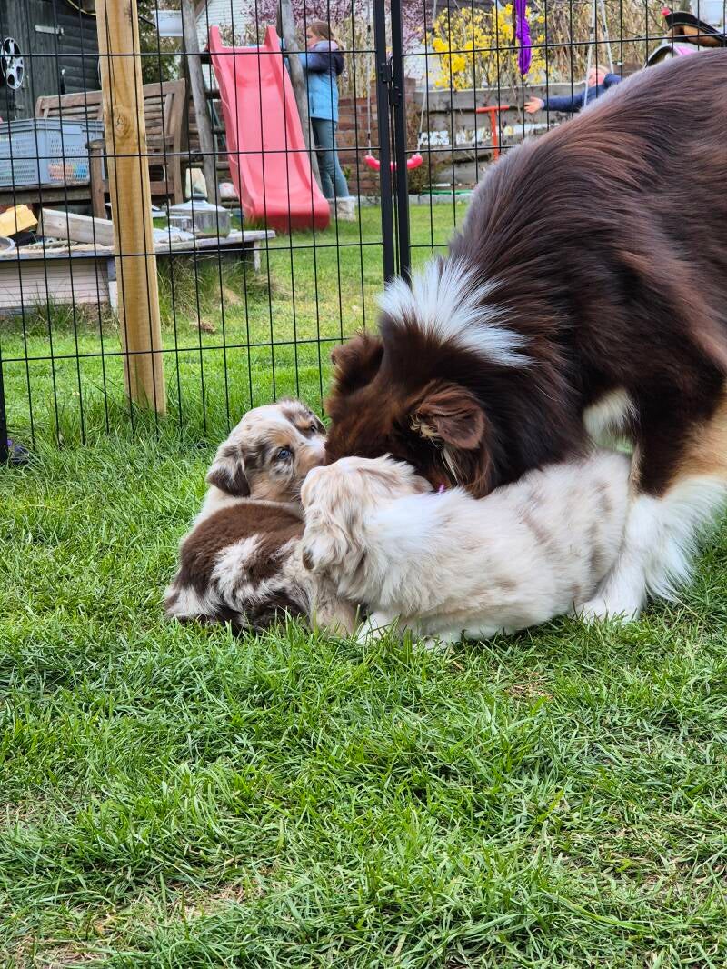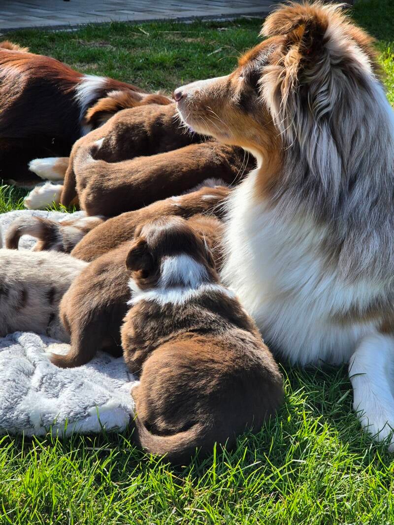 Nun liegen bereits 3 Wochen mit dieser fabelhaften Rasselbande hinter uns. Die kleinen durften das erste mal 10 Minuten frische Luft und Sonne genießen und Molly hat es sichtlich genossen, dass sie endlich mit den Welpies kuscheln durfte :) - an die Wurfbox lässt Mutti sie nämlich nicht.